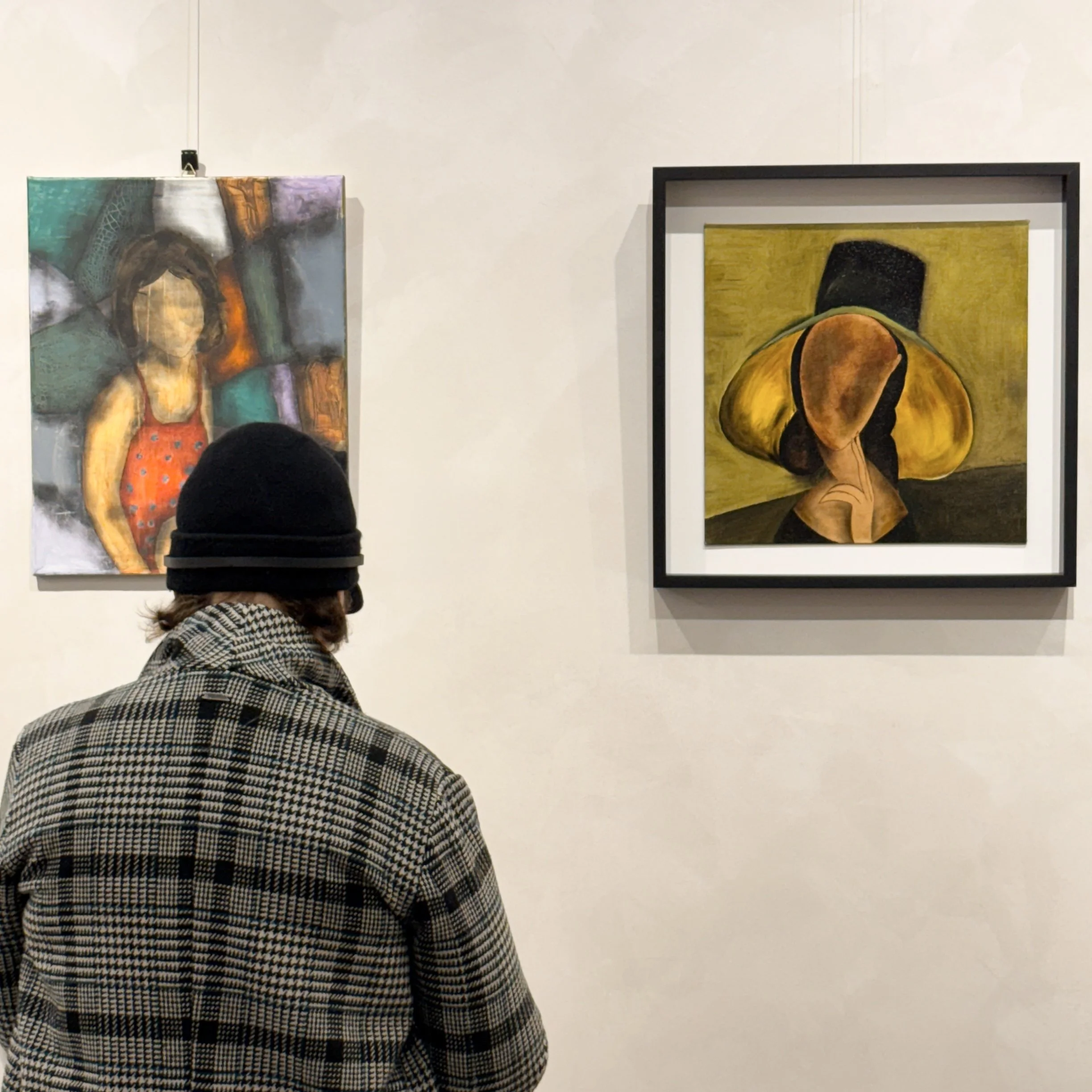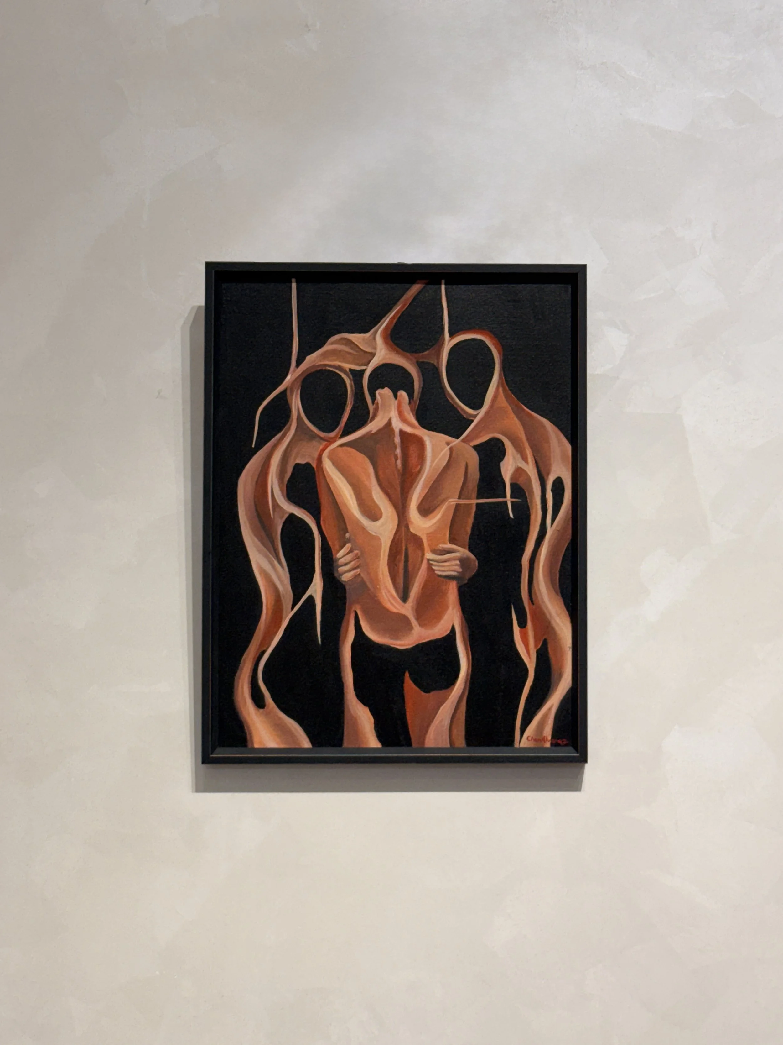 Chan Alvarez’s Six Degrees of Separation: Act III is plucked from the pantheon of his work that ruminates on the subject parted from themselves. In his series of meditations on existential thought, Chan paints humanoid figures and leaves them full of holes, each black punctum a deliberate front, tendering them unrepresentable. Act III is different, as the assonance of innards in his three figures puts what matters most at stake. Jean-Luc Nancy, in his book Corpus, reminds us that any talk of the subject (the ego, the self) is always talk of the body, “[T]he ontology of the body is ontology itself: being’s in no way prior or subjacent to the phenomenon here.” It no longer suffices us to say that we are who we are because we think, but rather: we are who we are because the body is the bottom line. “Mouth and mind are the same,” Nancy wrote, “it’s always the body.” The figure in the center with their head bowed is a thesis of a greater hurt, that we never truly cut on our losses when it comes to any matter of the flesh. As when Roland Barthes, for example, was left studying photographs of his mother after she passed away. “Photography thereby compelled me to a painful labor; straining towards the essence of her identity, (...) struggling among partially true, and therefore partially false.” (Loss is a strong tranquilizer to even the most stoic thinkers fettered to existentialism. “We are, despite our best intentions, stuck with essences, and essentialisms.” Peggy Phelan said in Unmarked. “And perhaps never more fully than when the body of the beloved has vanished.”) The wave of figures rushing in to console the one in the center means we have our work cut out for us, as co-inhibitors of the same plane with other bodies. It is maybe why Chan’s syntax of black holes is so recurring, to remind us that we have to keep filling each other up. I offer, then, as though it were a koan this haiku:
