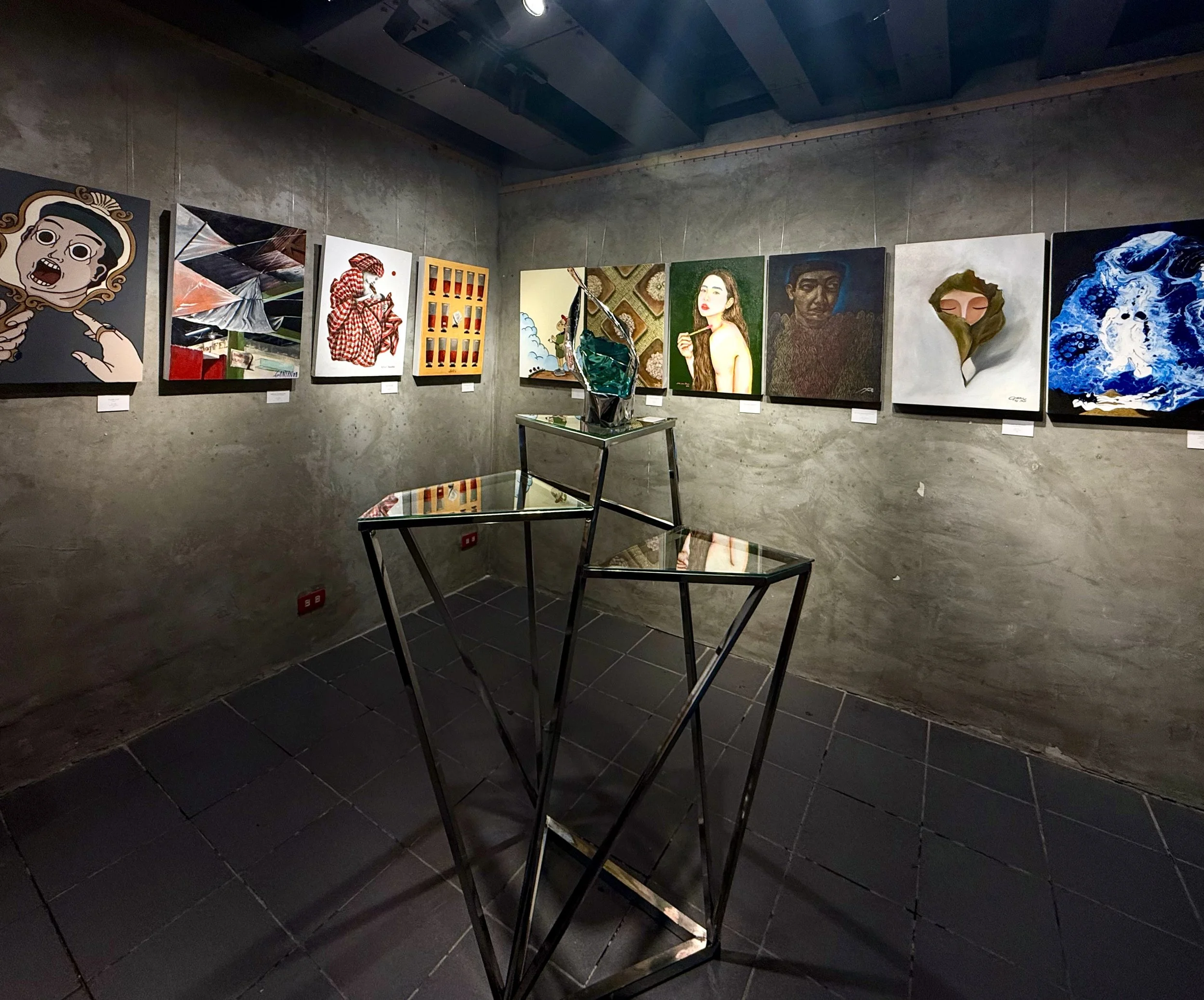 Positioned at the exhibition’s core, the polyhedral sculpture operates as a spatial and psychic anchor. Its shifting reflections implicate both viewer and artwork within a shared field of perception. Like the Freudian “id” itself, it remains anterior to representation: a field of latent energies from which the exhibition’s multiplicity of identities appears to emerge.